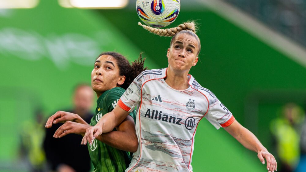 WOLFSBURG, GERMANY - OCTOBER 11: Giulia Gwinn of Bayern Muenchen jumps for a header with Cora Zicai of VfL Wolfsburg during the Google Pixel Women's Bundesliga match between VfL Wolfsburg Women's and FC Bayern München Women's at AOK-Stadion on October 11, 2025 in Wolfsburg, Germany. (Photo by Boris Streubel/Getty Images for DFB)